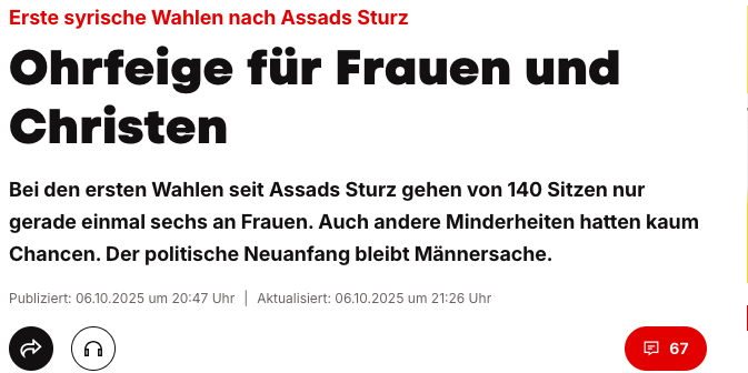 Neustes Beispiel: Nach der Parlamentswahl in Syrien gingen 6 von 140 Sitzen an Frauen – ganze vier Prozent. Und das bei einem Bevölkerungsanteil von fünfzig Prozent. Wer Frauen unter diesen Umständen als «Minderheit» bezeichnet, hat entweder den Taschenrechner verloren oder den Blick auf die Realität.